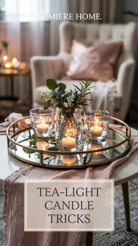 A simple mirror or decorative tray becomes an instant centerpiece when topped with a cluster of tea lights. The reflective surface doubles the glow, creating a more dramatic effect with minimal effort. Group an odd number of candles (three or five works beautifully) on any flat, reflective surface you have – even a serving platter works in a pinch. The light bounces and multiplies, creating a warm pool of illumination.