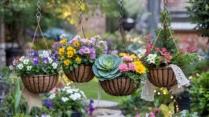 - Hanging baskets from eaves or pergolas