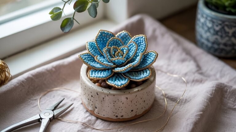 DIY beaded succulent tutorial - a beginner-friendly, step-by-step guide to make lasting, sparkly succulent decor using seed beads, wire, and a speckled planter.