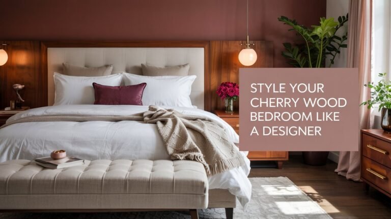 Cozy cherry wood bedroom ideas: deep burgundy walls, warm brass lighting, white linen bedding, tufted bench and lush greenery