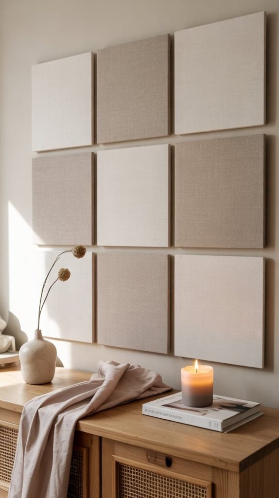 The most straightforward arrangement is a symmetrical grid. Use panels of the same size with complementary fabrics for a clean, modern look. Works well in home offices and media rooms.