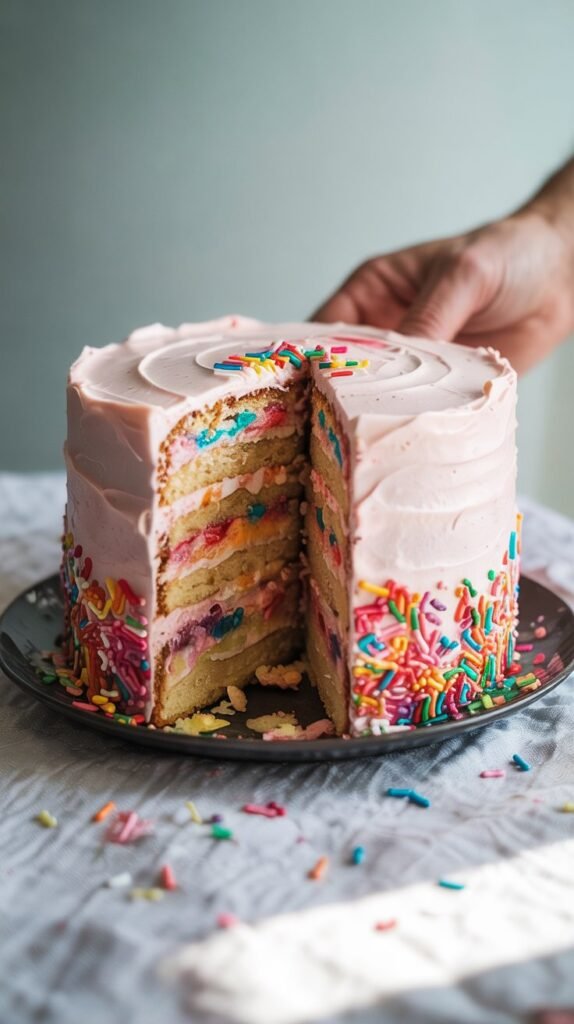 A confetti cake brings instant joy with colorful sprinkles hidden inside soft, fluffy layers. When you cut into the cake, the rainbow of sprinkles pops, fun, festive, and perfect for both kids and adults.