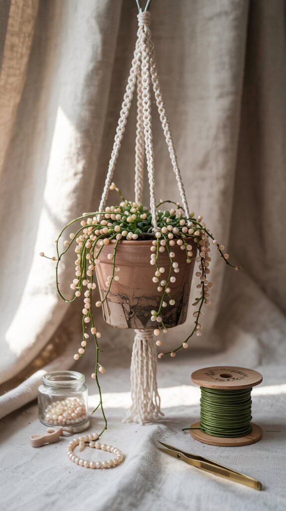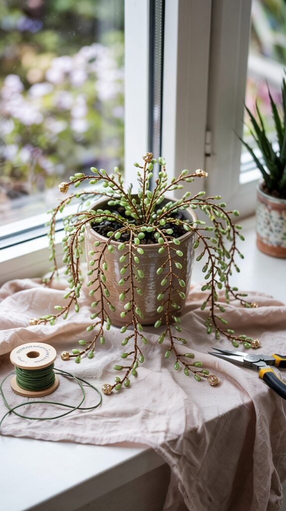 Create long, spiral stems with evenly spaced round beads. Let them trail over the edge of your pot for a dramatic cascading effect.