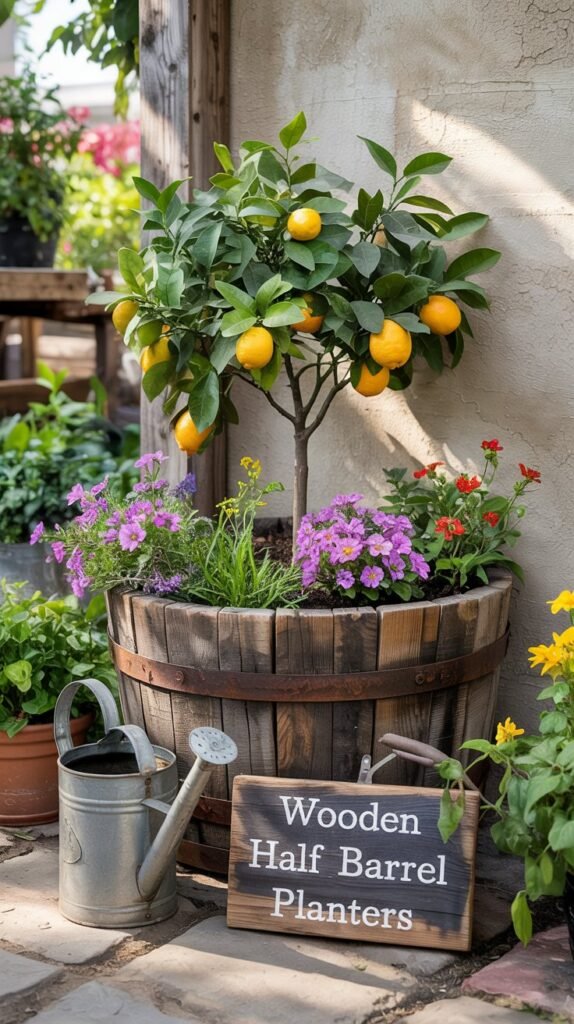 For a charming country garden aesthetic, repurposed wooden half barrels make excellent lemon tree containers. These rustic planters offer ample room for root development and blend beautifully with natural garden settings.