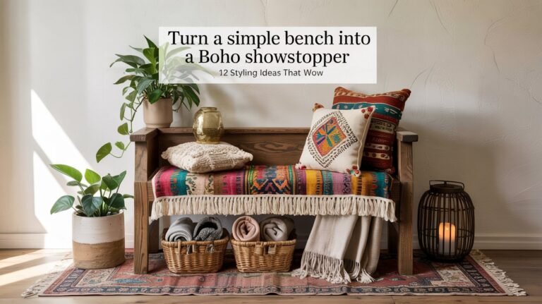 12 boho bench decor ideas to transform your entryway, layered textiles, woven baskets, plants, vintage cushions & ambient lighting for a cozy, organized welcome.